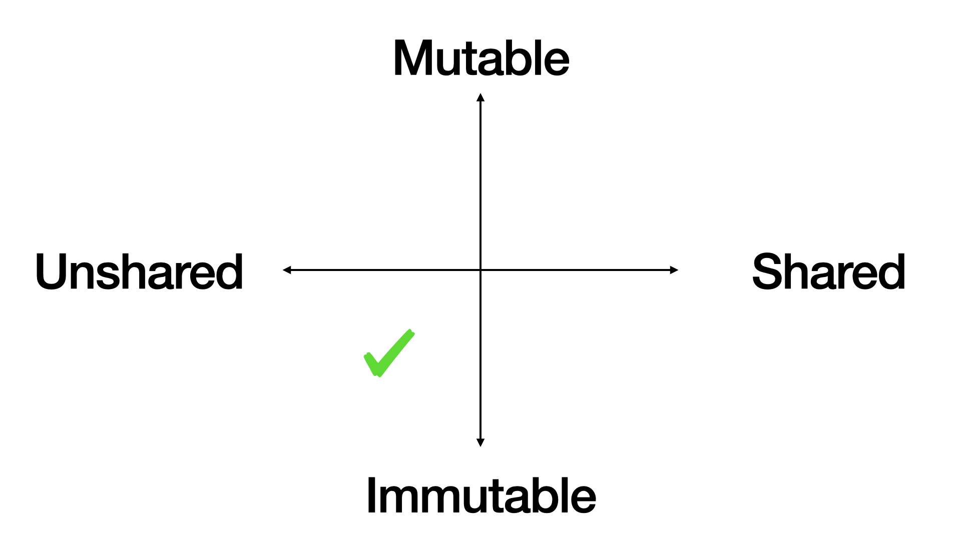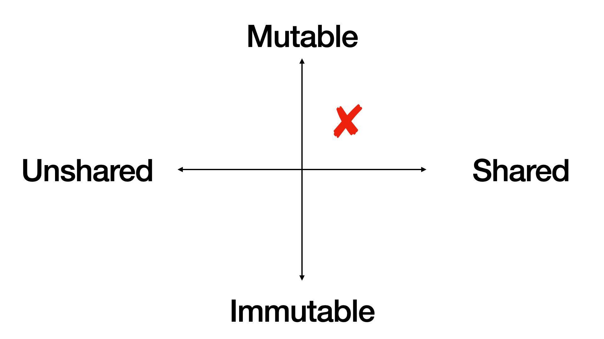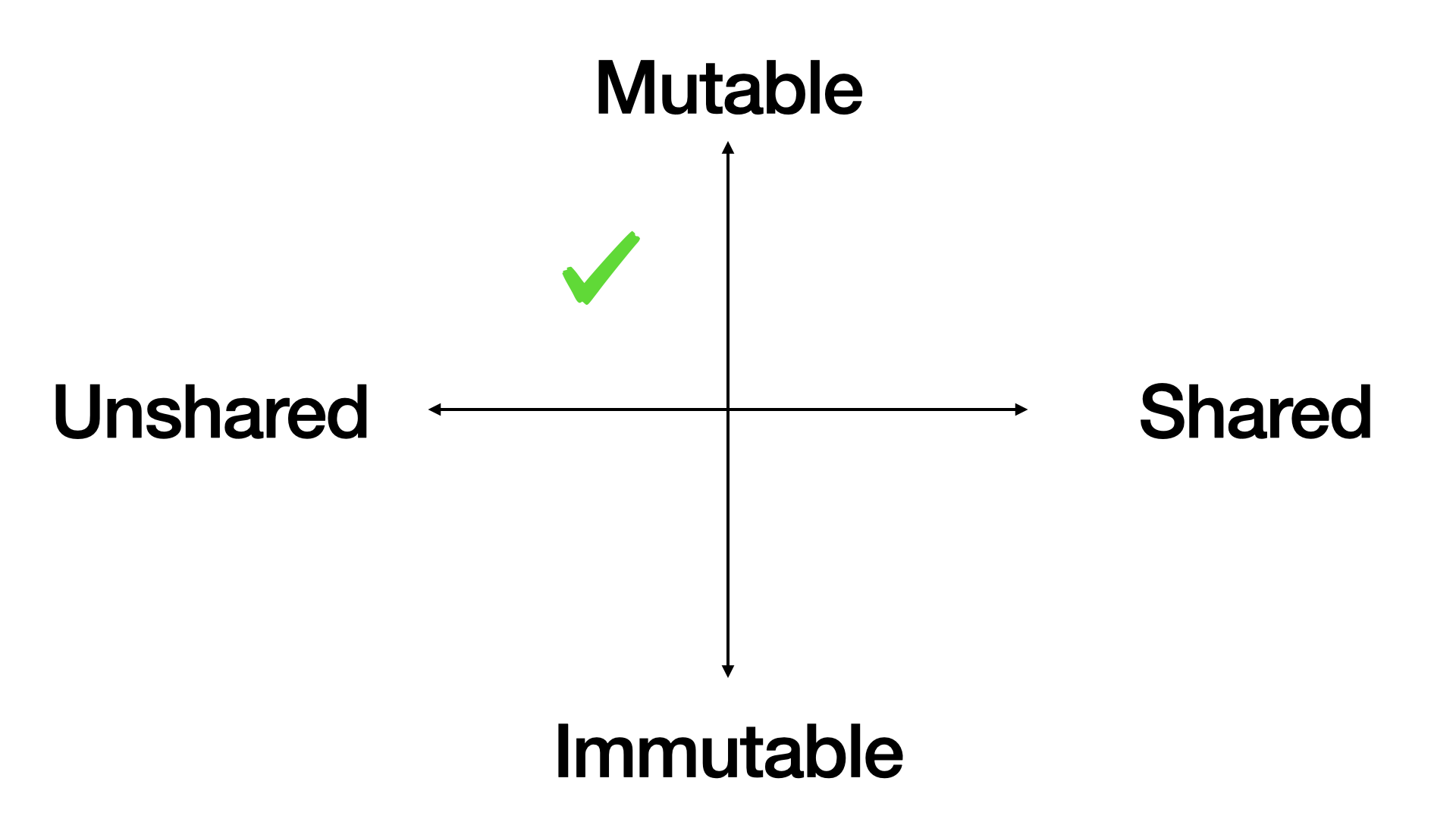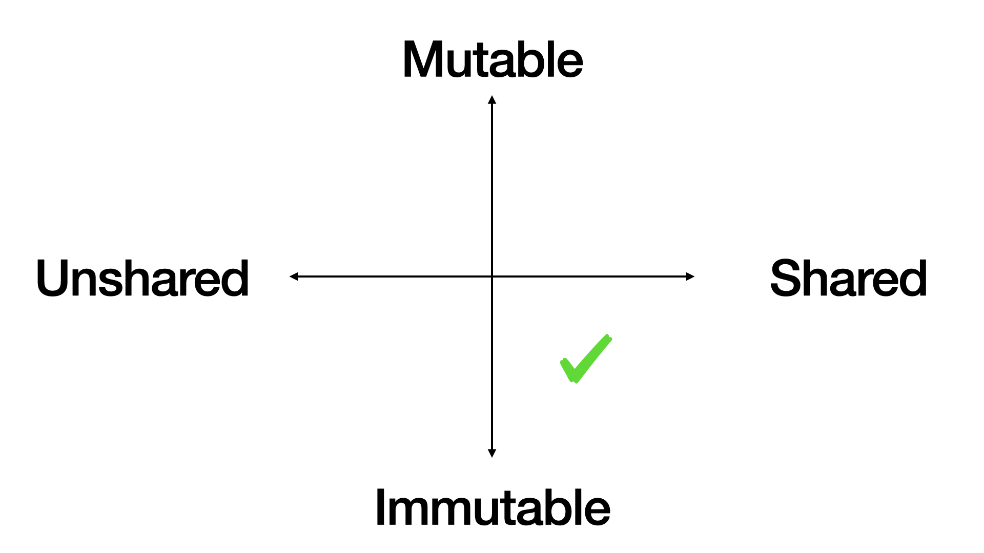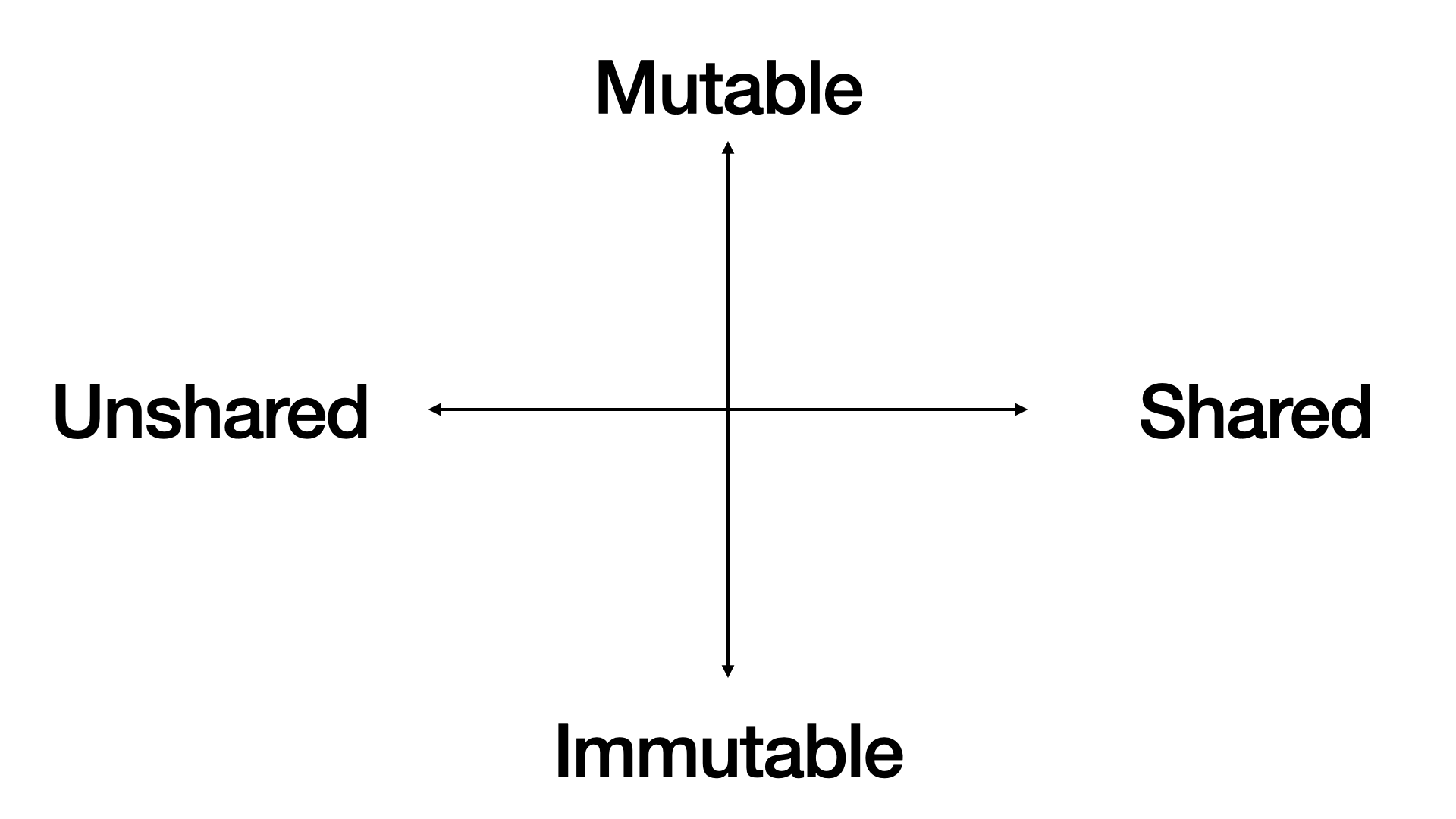 First, we draw two spectra. Mutable vs immutable data vertically, and shared vs unshared data horizontally. That create four quadrants.
