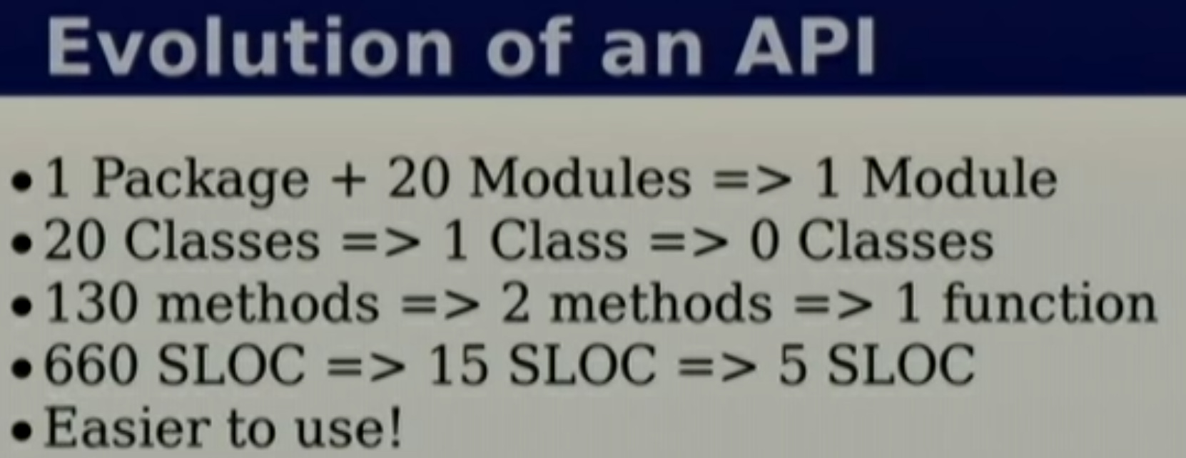 In this example, a real-world API library went from 660 lines to 5 lines, from 20 classes down to 0 classes (just one function). The question is: Where did all the domain concepts go? I'm not exactly sure since he doesn't present all of the code. But I can guess. How many classes wrapped an existing type, such as a String or a HashMap? How many classes defined redundant ideas, such as new error types, already existing in the standard library? How many classes held unnecessary state that you could pass as an argument? So, the answer is that defining those domain concepts did not add any behavior. Your custom EmailAddress class is constructed with a String and eventually unwraps to a String anyway. Why not just use a String?